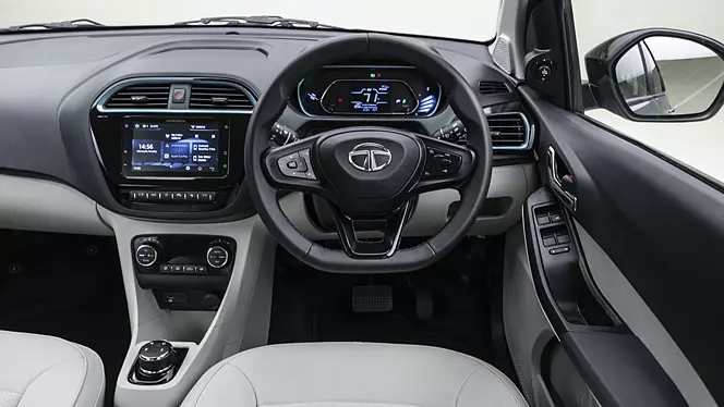 Like the exterior, the interior is based on electric blue for the digital instrument cluster and air vents. In terms of equipment, the Tiago EV comes with Harman’s 7-inch touchscreen infotainment, Android Auto and Apple CarPlay, a height-adjustable driver’s seat, automatic climate control, and a flat-bottom steering wheel fitted with controls.