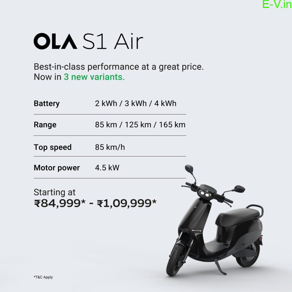 Pricing for the Ola S1 Air starts at Rs 84,999 for the entry-level (2kWh), Rs 99,999 for the mid-range (3kWh), and Rs 109,999 for the top-end (4kWh). Customers who book the 2.5kWh variant of S1 Air during Diwali will be upgraded to the 3kWh variant at no additional charge.
