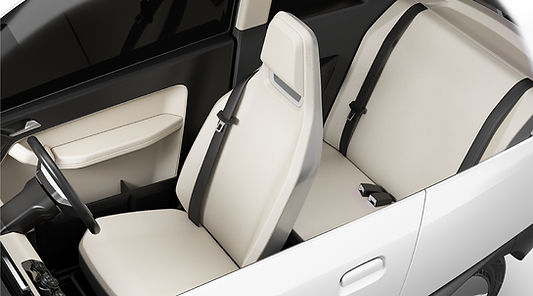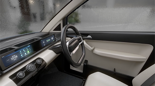 The Eva is Android Auto/Apple Car Play compatible and features a panoramic sunroof, wide driver visibility, and adjustable seats. On top of a battery pack, the smart car has solar panels on its roof for additional charging.