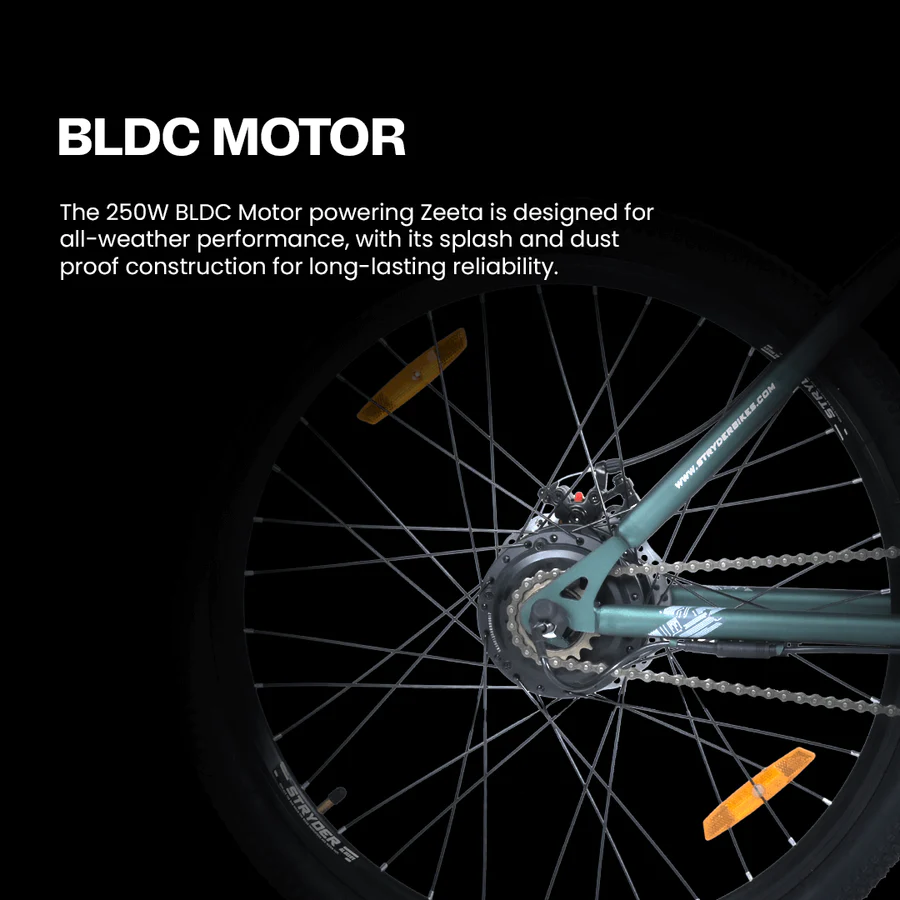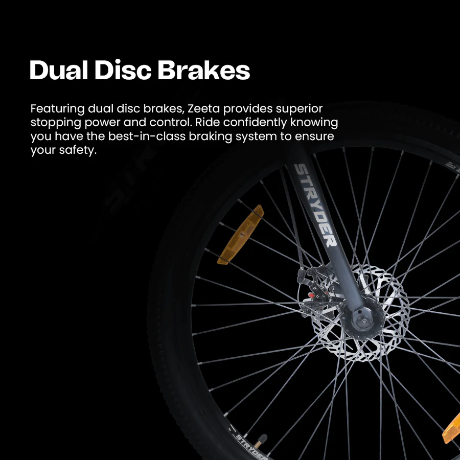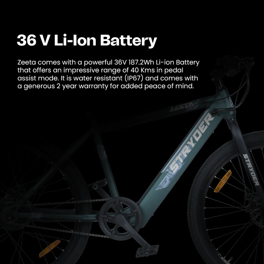 Stryder Zeeta is equipped with a powerful 36V 250W BLDC rear hub motor to give you a seamless experience. Its innovative design includes an in-frame lithium-ion battery and controller that can be fully charged in just 3 hours, delivering an impressive range of up to 40km in hybrid riding mode on a single charge. Offers. Zeeta’s advanced safety features include auto-cut braking for maximum rider protection.